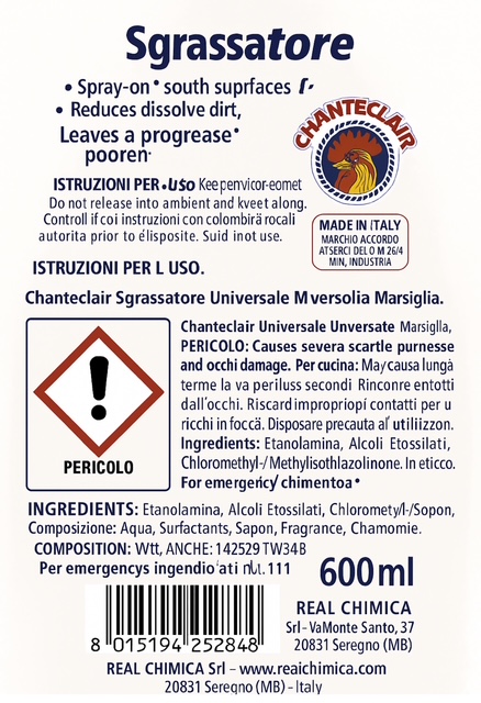 Πολυκαθαριστικό / Λιποκαθαριστής Chante Clair Sgrassatore Universale 600ml, με Σόδα. Το Chante Clair Sgrassatore Universale σε πρακτική μορφή ψεκασμού είναι ένα απορρυπαντικό κατάλληλο για όλους τους τύπους βρωμιάς. Για οικιακή και επαγγελματική χρήση, δοκιμάστε το σε σόμπες, πάγκους εργασίας, παντζούρια, μηχανικά μέρη, γρανάζια και ρούχα.