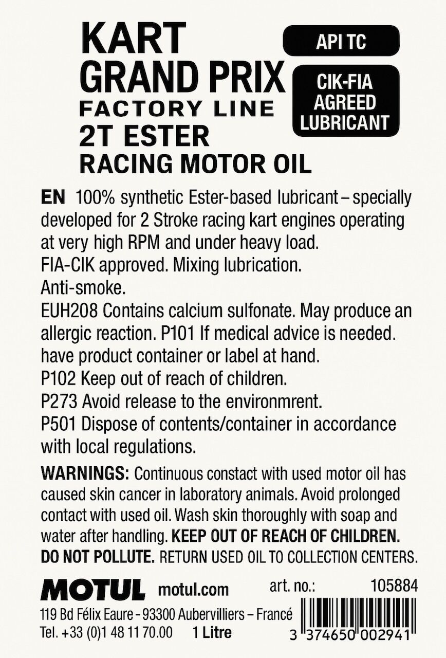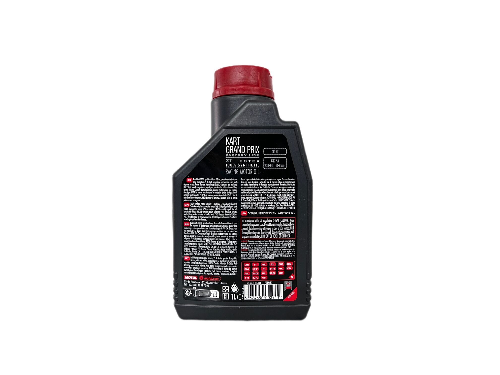 Motul Kart Grand Prix Συνθετικό Λάδι για Δίχρονους Κινητήρες 1lt. Λιπαίνει τέλεια τους κινητήρες ακόμα και σε ακραίες συνθήκες χρήσης, 23.000 στροφές/λεπτό και υψηλές θερμοκρασίες. Αποτρέπει το κλείδωμα των δακτυλίων του εμβόλου.