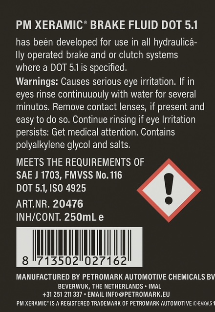 PM XERAMIC® BRAKE FLUID DOT 5.1 has been developed for use in all hydraulically operated brake and or clucth systems where a DOR 5.1 is specified. PM Xeramic® Brake Fluid DOT 5.1 has been especially developed for karting.