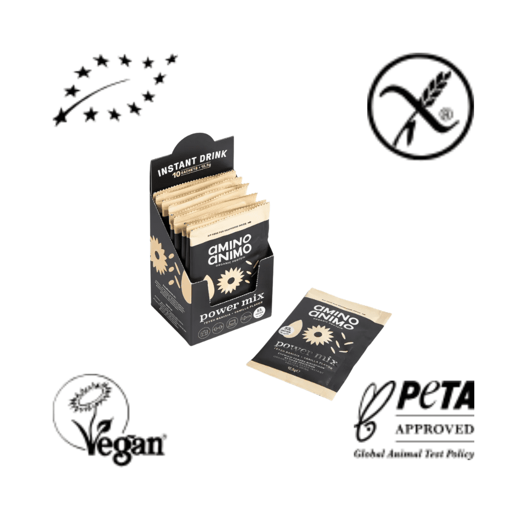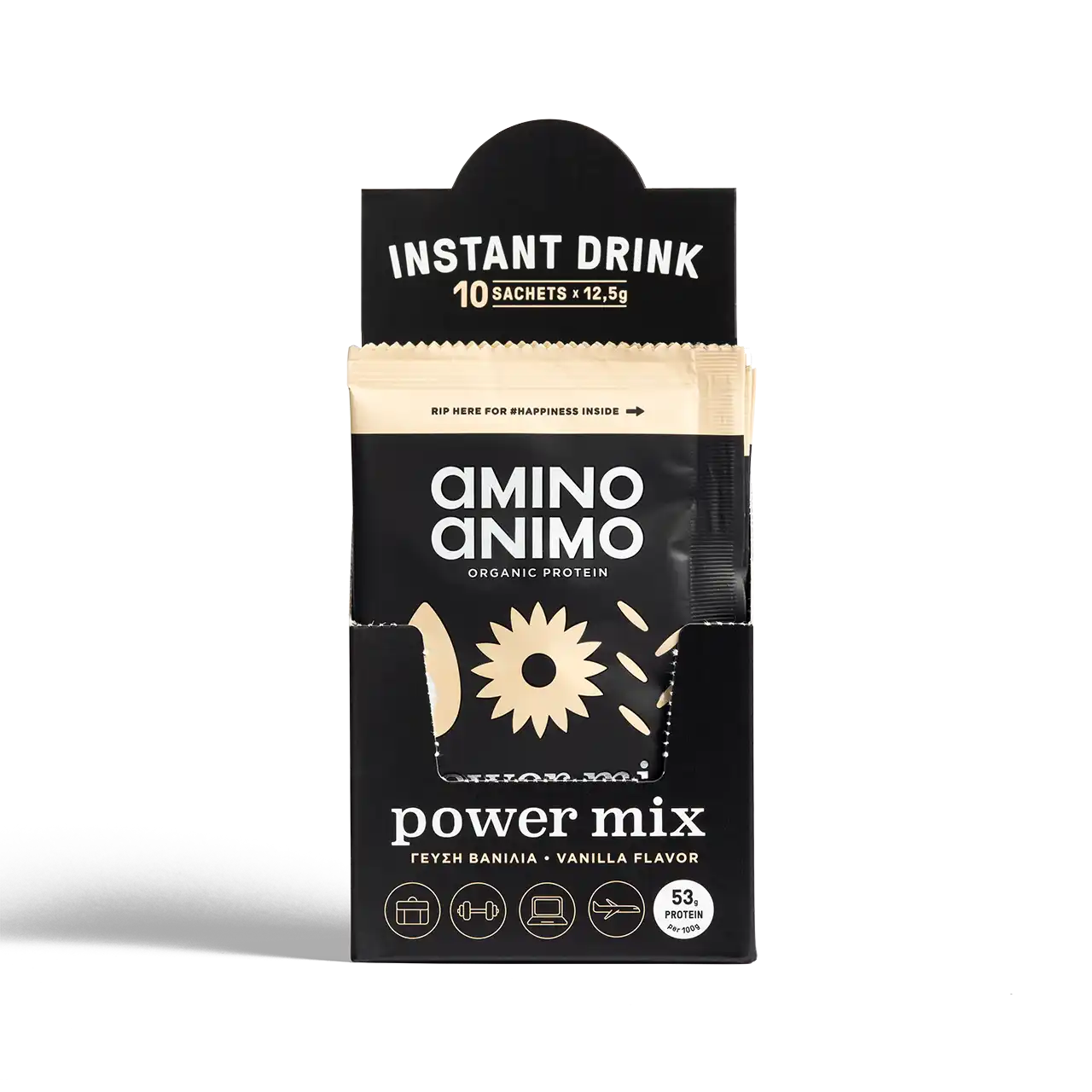 Η πρωτεΐνη AMINO ANIMO Power Mix Vanilla με φυσική γεύση βανίλια περιέχει βιολογικές πρωτεΐνες Αμυγδάλου, Ρυζιού και Ηλιόσπορου υψηλής καθαρότητας και πρεβιοτικά (Ινουλίνη).